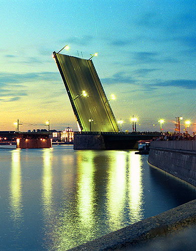 En verano cinco millones de habitantes y los turistas de San-Petersburgo gozan del periodo de las noches blancas, cuando la cuidad es fantastica. Con 21 puentes levadizos que se abren por la noche para dar paso a los barcos grandes adquiere un aspecto extraordinario. Este periodo comienza en el fin de Mayo y dura todo el junio y la primera mitad de julio, en total 1 mes y media. Durante las noches blancas el sol casi no se pone